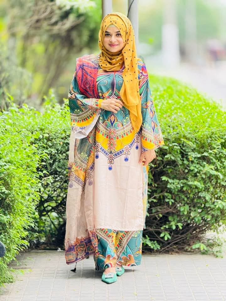 বর্তমানে বাজারে মোস্ট ডিমান্ডিং ফ্যাব্রিক হলো চেরি সিল্ক! এই রেডিমেড থ্রি পিসটি সেই চেরি সিল্কের উপর আকর্ষণীয় ডিজিটাল প্রিন্টের কাজ করা।