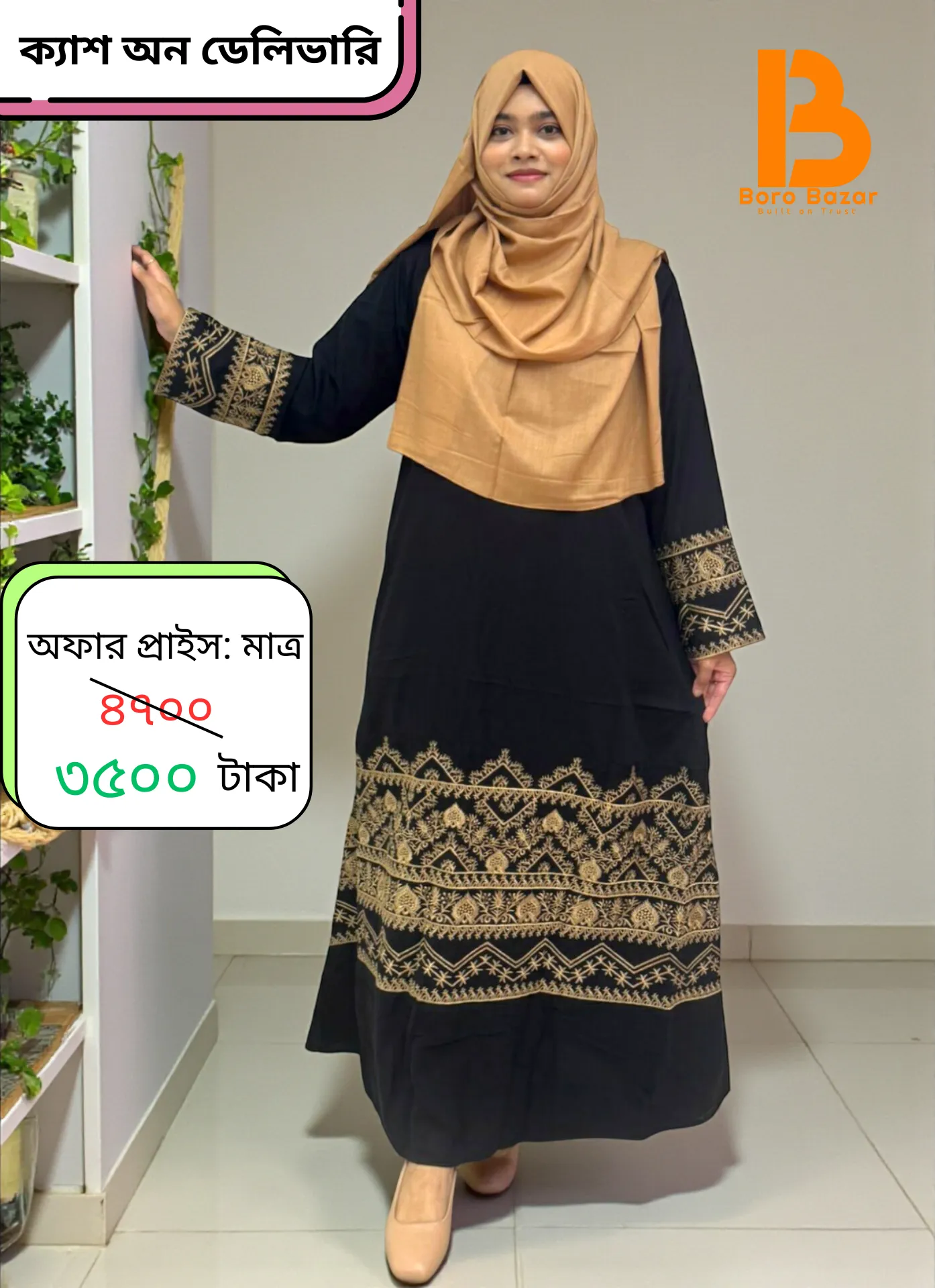 প্রচণ্ড গরমেও নিজেকে স্নিগ্ধ আর মার্জিত রাখতে আমরা নিয়ে এলাম প্রিমিয়াম BMW ফেব্রিকের তৈরি ওয়ান পার্ট বোরকা। এর হাতা এবং সামনের অংশে নিখুঁত ও ভারী এমব্রয়ডারি কাজের কারুকাজ আপনাকে দেবে এক রাজকীয় লুক।