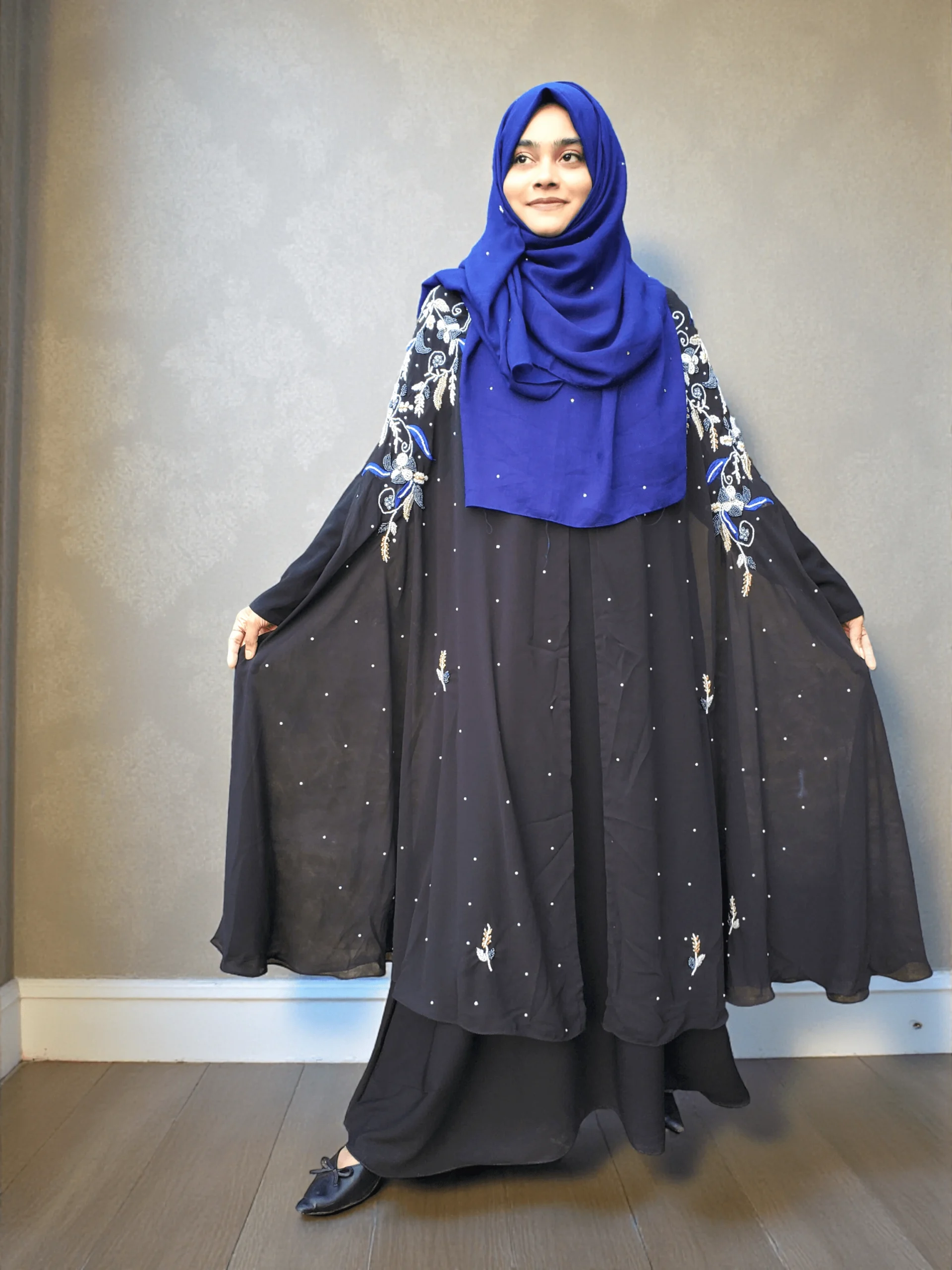 বিএমডব্লিউ উপাদান দিয়ে তৈরি এক ভাগ বোরখা, যার বাহুতে এবং সামনে ভারী সূচিকর্মের কাজ।