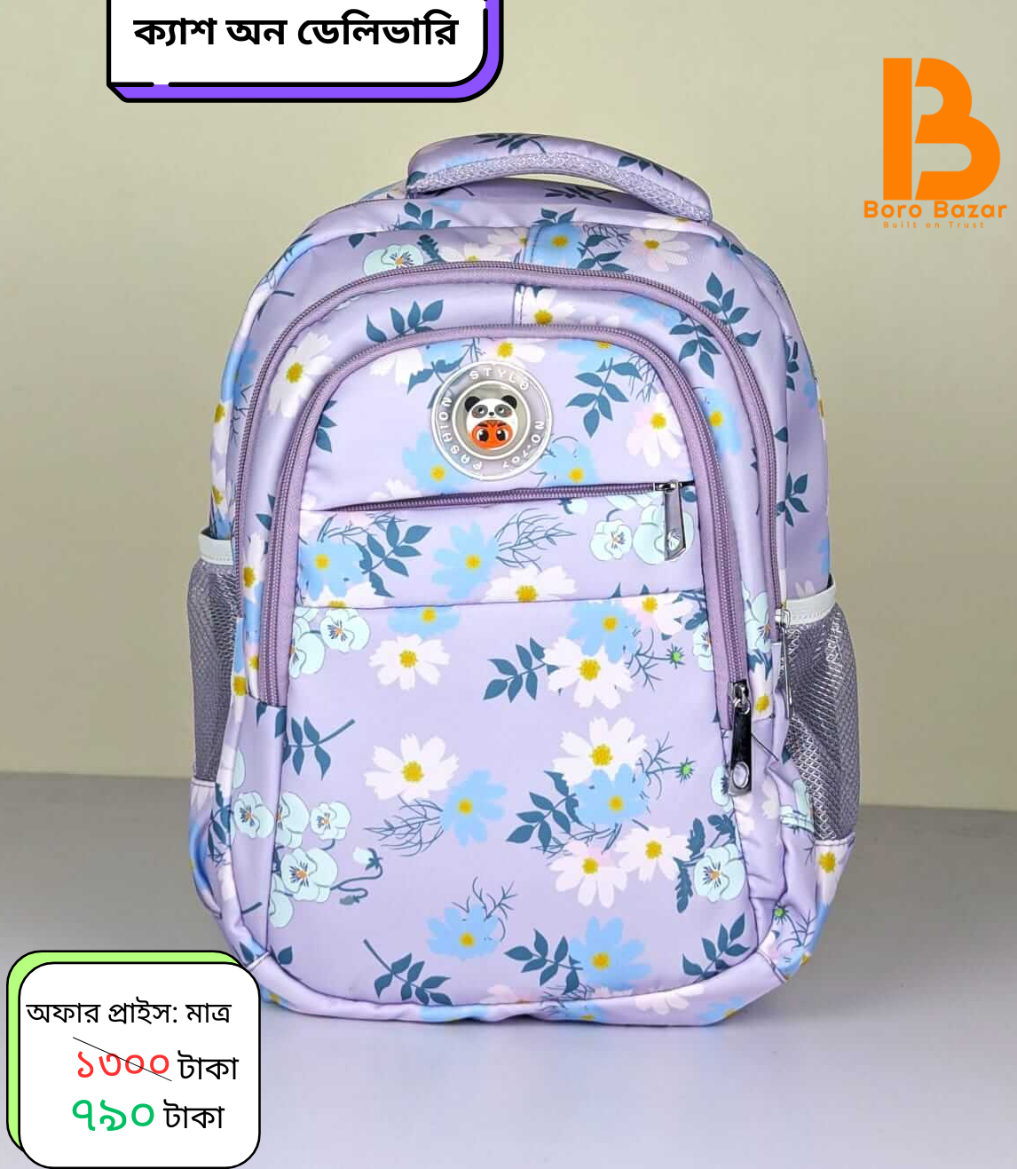 আপনার সোনামণির স্কুল যাত্রাকে আরও সহজ এবং ফ্যাশনেবল করে তুলুন। এই ব্যাগটি শুধু দেখতেই সুন্দর নয়, এটি দীর্ঘস্থায়ী এবং ব্যবহার করাও খুব আরামদায়ক। ✳️কেন এই ব্যাগটি আপনার বাচ্চার জন্য সেরা পছন্দ? ➡️আকর্ষণীয় ডিজাইন: সুন্দর নীল রঙের ওপর সতেজ ফুলের (Floral) প্রিন্ট এবং কিউট পান্ডা লোগো শিশুদের খুব পছন্দ হবে। ➡️বিশাল জায়গা (Large Capacity): বই, খাতা, পেন্সিল বক্স এবং টিফিন বক্স রাখার জন্য রয়েছে পর্যাপ্ত জায়গা এবং আলাদা চেইন পকেট। ➡️টেকসই ফেব্রিক: উন্নত মানের মজবুত ফেব্রিক দিয়ে তৈরি, যা প্রতিদিনের ধকল অনায়াসেই সইতে পারে। ➡️আরামদায়ক স্ট্র্যাপ: এর চওড়া এবং নরম কাঁধের স্ট্র্যাপ বাচ্চার পিঠ ও কাঁধের ওপর বাড়তি চাপ সৃষ্টি করবে না। ➡️সাইড পকেট: পানির বোতল বা ছাতা রাখার জন্য পাশে রয়েছে নেট পকেট। ✳️বিশেষত্ব: ➡️সহজেই পরিষ্কারযোগ্য। মজবুত এবং স্মুথ জিপার সিস্টেম। ➡️স্কুল, কোচিং বা যেকোনো ছোট ভ্রমণের জন্য আদর্শ। "আপনার বাচ্চার মুখে হাসি ফোটাতে আজই বেছে নিন এই সুন্দর ব্যাগটি!"😊