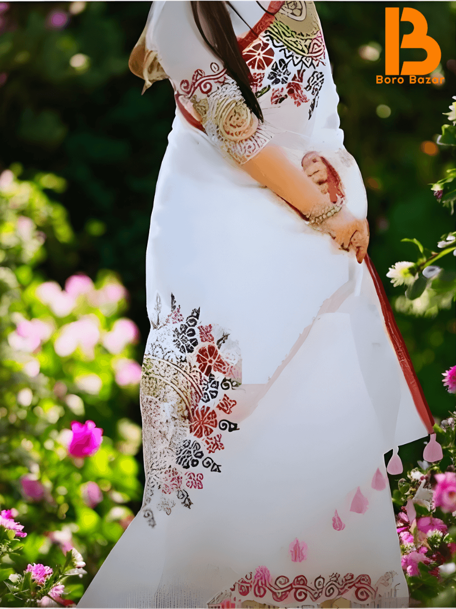 হাফসিল্ক শাড়ীতে হ্যান্ডপ্রিন্ট তুলির কাজ করা