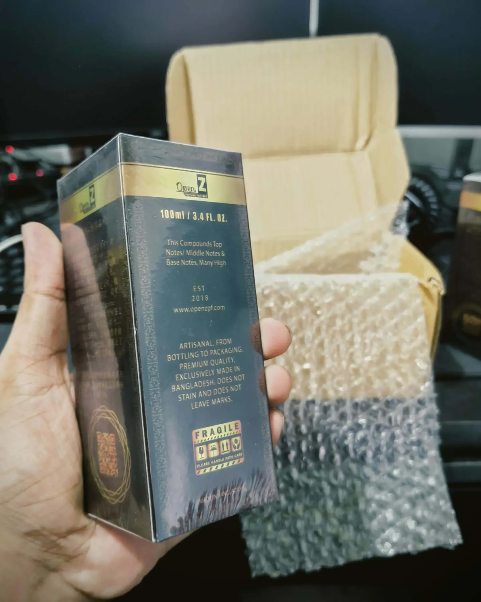 - শুধুমাত্র বাহ্যিক ব্যবহারের জন্য: অ্যালকোহল/ফ্র্যাগন্যান্সে সংবেদনশীল ব্যক্তিদের জন্য উপযোগী নাও হতে পারে। আমাদের কাছে অ্যালকোহল-ফ্রি অয়েল-বেসড পারফিউম আছে, যেগুলো 100% হালাল। আমাদের কিছু সুগন্ধি খুবই স্ট্রং হওয়ায় কাপড়ে দাগ ফেলতে পারে। শুধুমাত্র জামার ভিতরের অংশে ব্যবহার করুন।